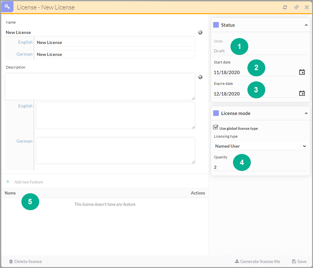 After a name has been assigned to this new license, a description can be added. Both name and description can be translated by clicking on the <img src="https://2608258621-files.gitbook.io/~/files/v0/b/gitbook-x-prod.appspot.com/o/spaces%2F-M8HTRblOKav_qm4KEx6-887967055%2Fuploads%2F1jUoDPObkDnXvnNwBqum%2Fimage.png?alt=media&#x26;token=84df6f4f-ab4a-4279-ad3f-b95b4f95dcda" alt="" data-size="line">(available languages are English and German). In the **Status** panel right basic settings can be made. At the top you can see the state of the license (1). In our case, because we created the license from scratch, the state is *Draft*. After that you have to enter a start (2) and end date (3). The dates determine how long the license is active or usable.